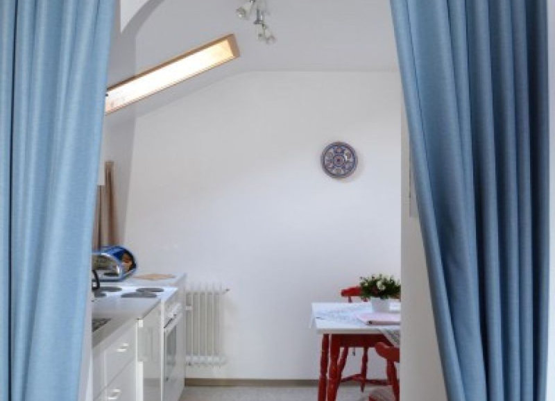 Wohn-Schlafzimmer mit seperater Küche mit Blick auf die Berge.